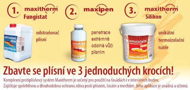 Komplexní sanační systém Maxitherm je osvědčené řešení pro odstranění plísní ze zdiva v interiéru i exteriéru. Nabízí dlouhodobou ochranu zdí před plísněmi, řasami a mechy. Systém je postaven na třech jednoduchých a efektivních krocích, které nejen odstraní plíseň, ale především řeší její příčinu – kondenzační vlhkost a tepelné mosty.